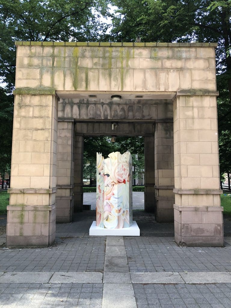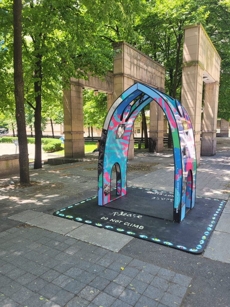 As an LGBTQ2S+ public artist, my key process is working within the local community to bring vibrant artwork that ties us together. This process creates a thriving, compassionate, and safe neighbourhood that builds strength and pride. The BE ME archway installation shares an opportunity to be part of this, to walk through an archway of community. Reflecting on how each of us contributes to this strength by being our authentic selves. Encouraging us to BE ME.