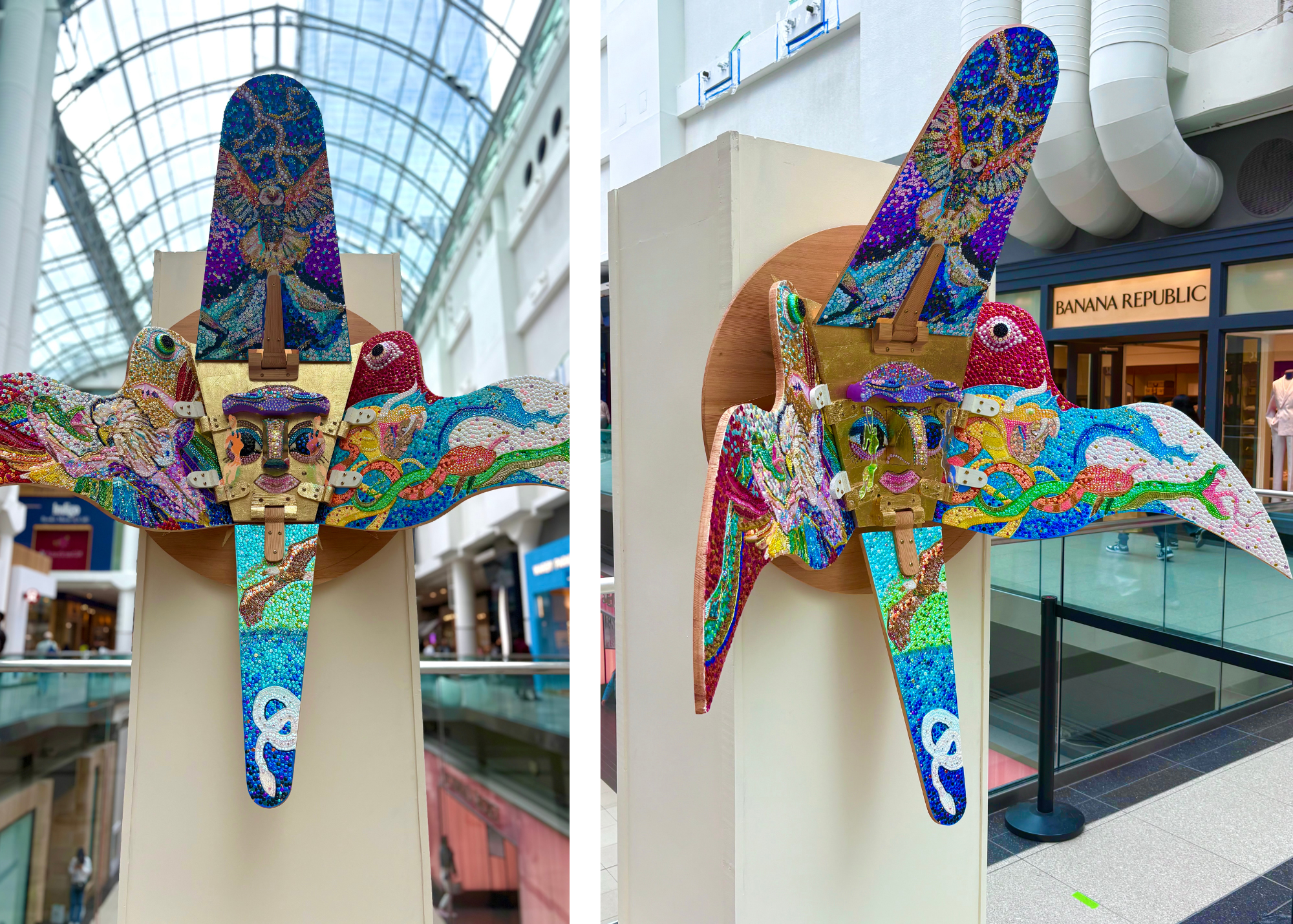 In many Indigenous traditions, the Thunderbird is a sacred force — a bringer of storms, a protector, and a symbol of balance. This installation reimagines the Thunderbird as a metaphor for queer identity: powerful, radiant, and resilient. Made from wood, sequins, and beads, it bridges tradition and transformation, honouring Indigenous knowledge and queer expression. Queerness, like the Thunderbird, is not marginal but cosmic — a force that brings clarity, creates sanctuary, and reclaims space through beauty and resistance.