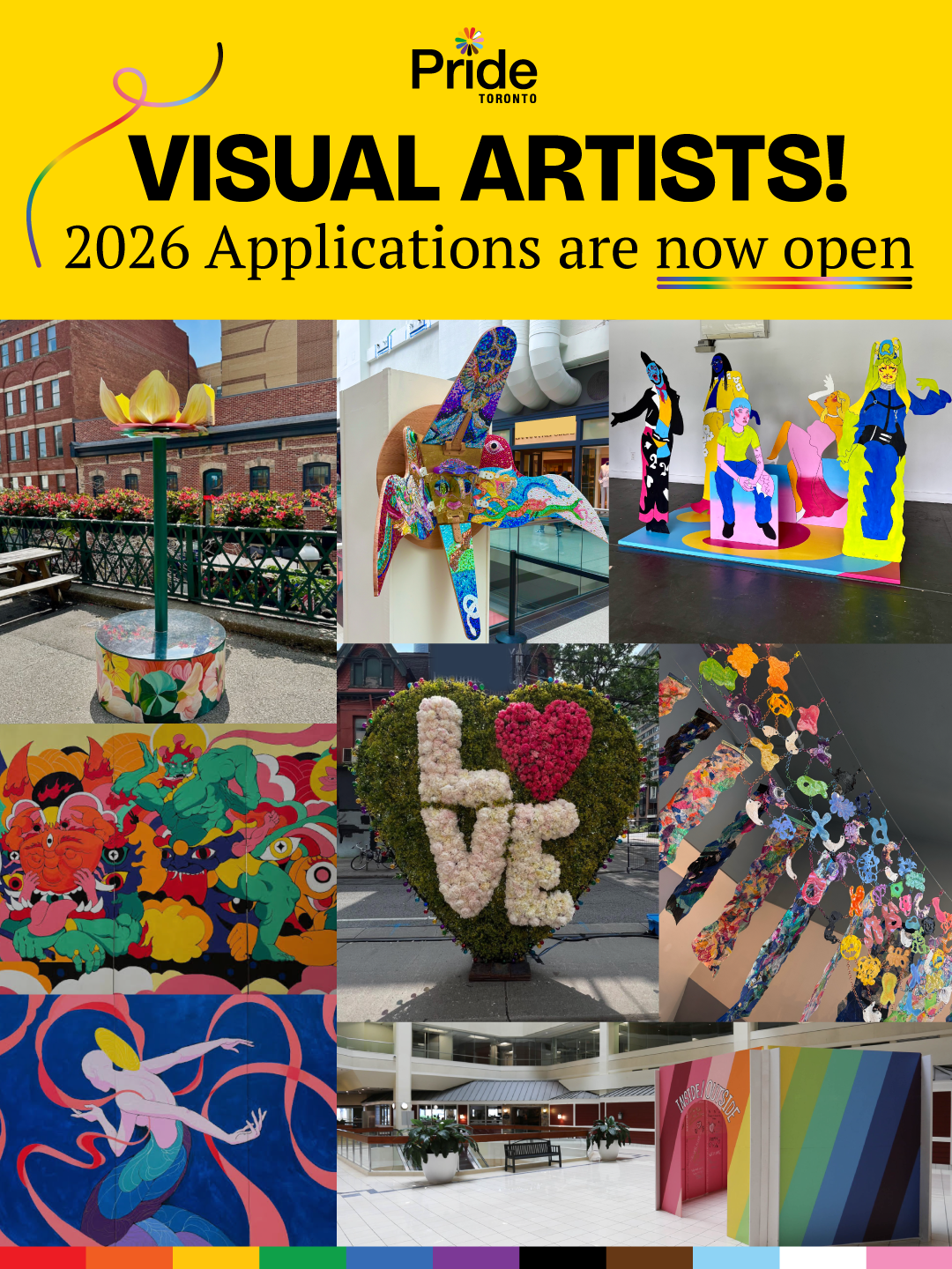Welcome to Pride Toronto’s Visual Arts program, which celebrates local 2SLGBTQI+ artists through various initiatives. Our Installation Art Program supports artists in sharing messages of love and freedom, while the Affiliate Art Program connects them with venues for exhibitions and collaborations. The Art Zone enhances audience engagement during Pride Week, and it transforms urban spaces into immersive experiences. Through curated exhibitions and partnerships, we foster visibility and meaningful dialogue within the 2SLGBTQI+ community. Discover the creativity of 2SLGBTQI+ artistic expression with Pride Toronto’s Visual Arts program, where creativity knows no bounds.