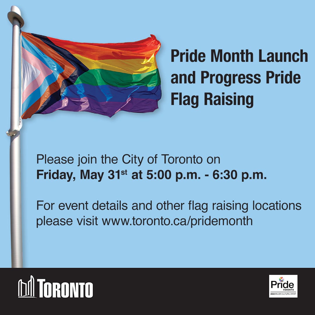 Please join the City of Toronto on Friday, May 31, 2024 at the Progress Pride Flag Raising to kick off Pride Month…