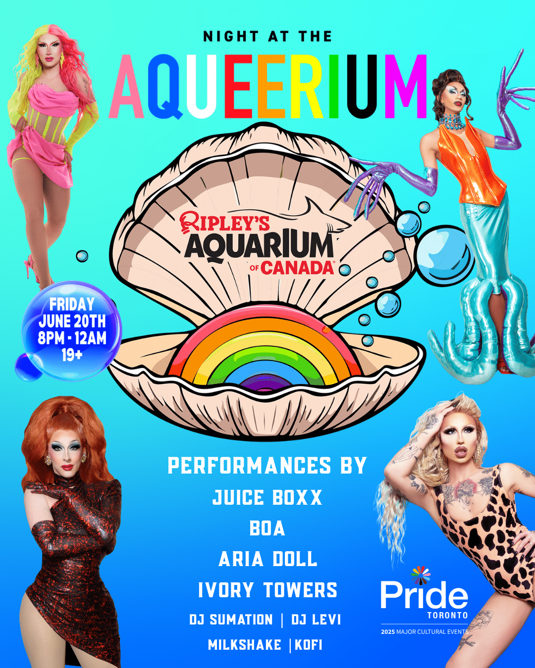 Dive into Pride weekend at Night at the Aqueerium, Toronto’s unique underwater Pride party. Now in its ninth year, this fully accessible event features electrifying drag performances, hot DJs, and themed activations for an unforgettable night of community, cocktails, and fun beneath the sea.