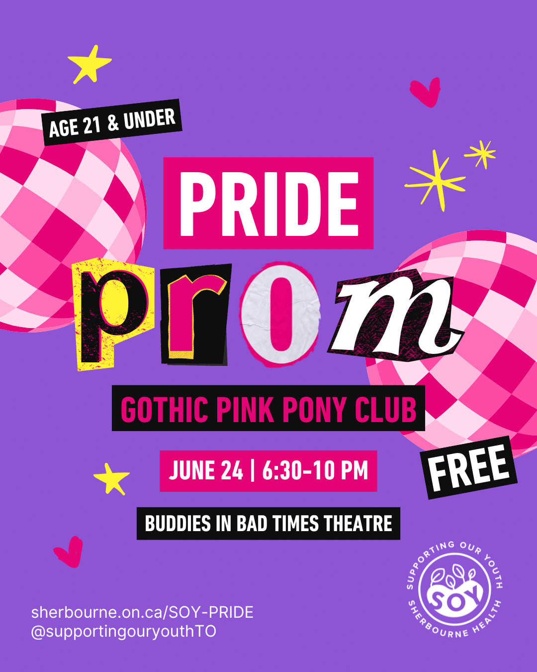 Supporting Our Youth (SOY) invites 2SLGBTQ+ youth to celebrate 25 years of Pride Prom with this year’s “Gothic Pink Pony Club.” Dress code: Goth Glamour or Unapologetic Queer.